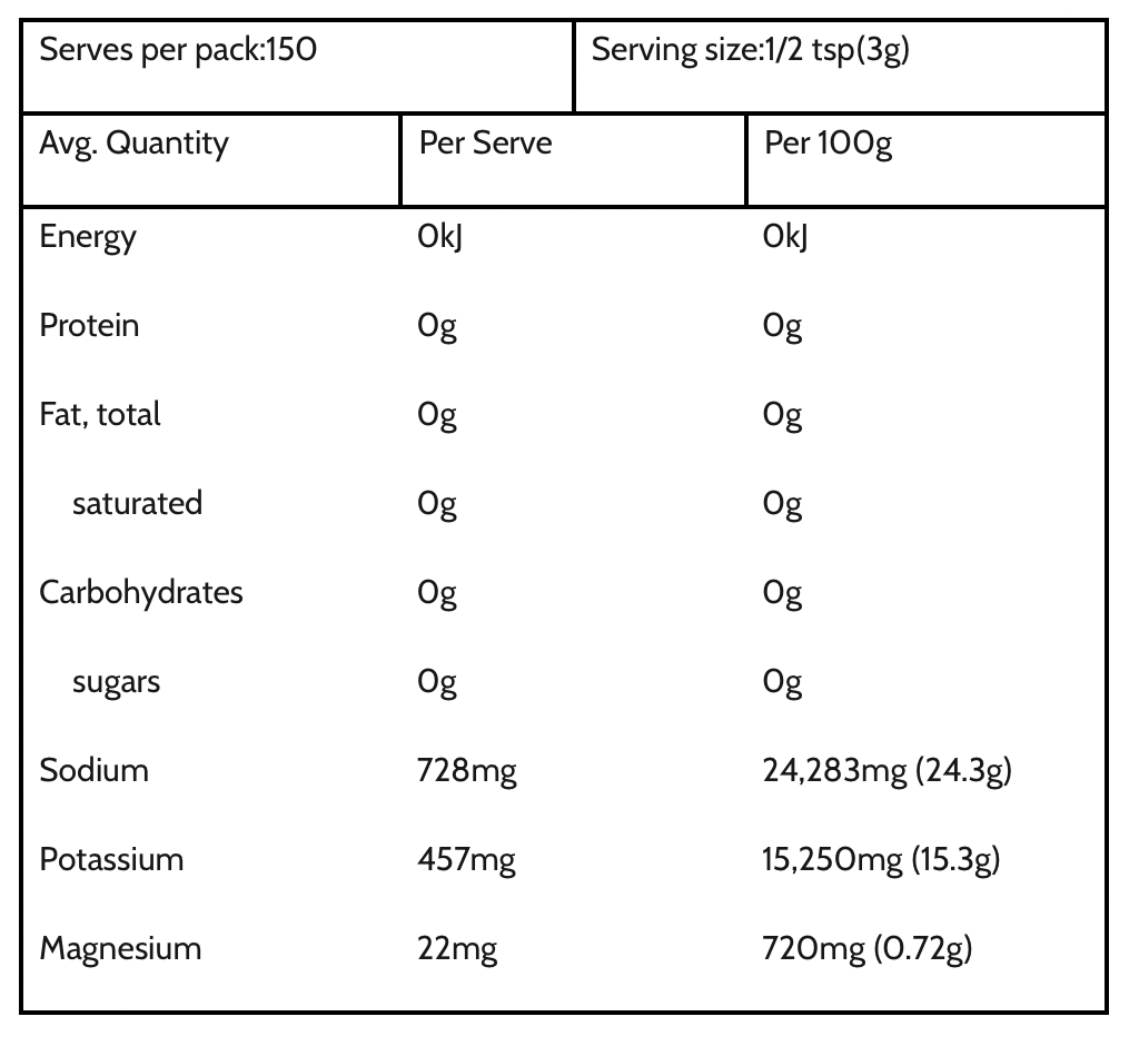 INGREDIENTS: ancient lake salt, potassium chloride, natural liquid magnesium solution.