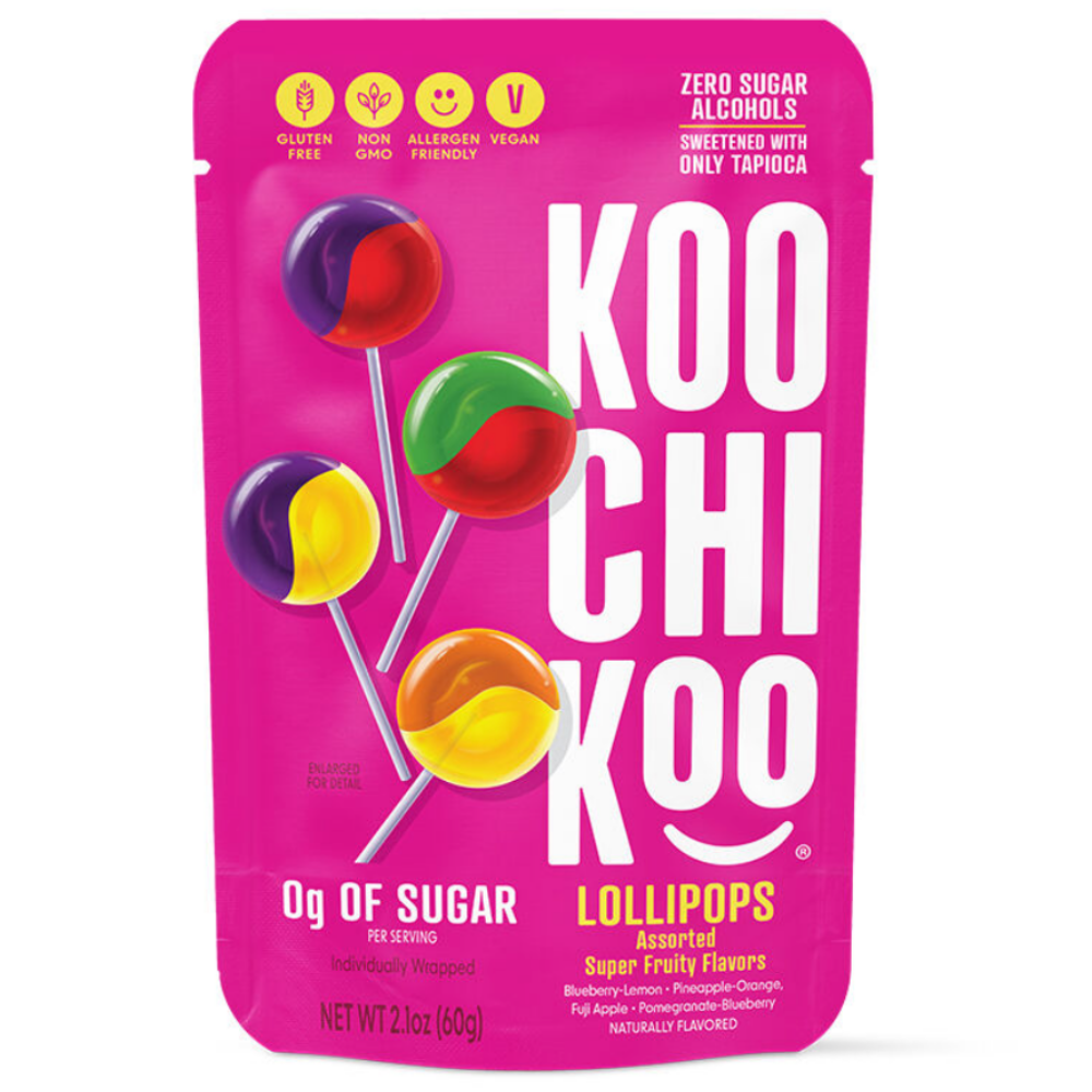 Sweetened with organic tapioca fibre, these delicious and nutritious organic lollipops deliver a sweet & sour taste certain to Tickle Your TastebudsTM and make you smile. Koochikoo pops are gluten free, vegan, Non GMO and contain only 10 calories. Available in four superfruit flavour combinations: Pineapple Orange, Fuji Apple, Blueberry Lemon & Pomegranate Blueberry.