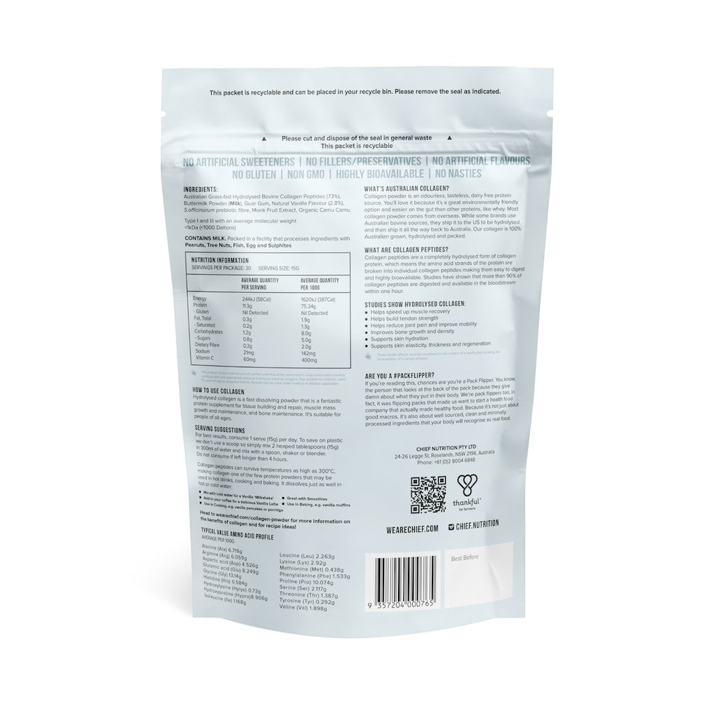 Ingredients: Australian Grass-fed Hydrolysed Bovine Collagen Peptides (73%), Buttermilk Powder (Milk), Guar Gum, Natural Vanilla Flavour (2.8%), S.officinarum prebiotic fibre, pure Monk Fruit Extract, Organic Camu Camu.