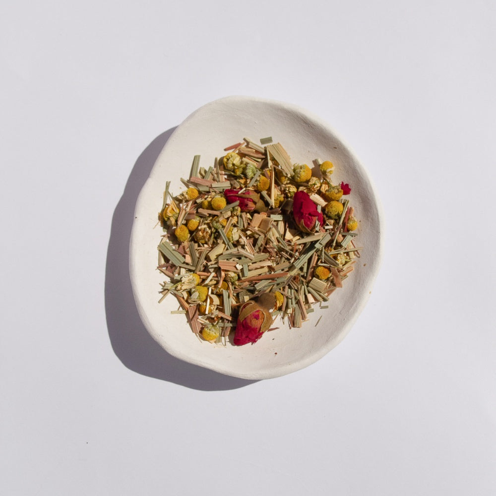 Experience the serene, restorative qualities of our Calm Tea, a gentle blend of lemongrass, chamomile flowers, and red rose petals. Designed to ease anxiety and support those moments when you’re feeling overwhelmed, this tea quiets the mind and encourages relaxation, providing a soothing retreat in every sip.