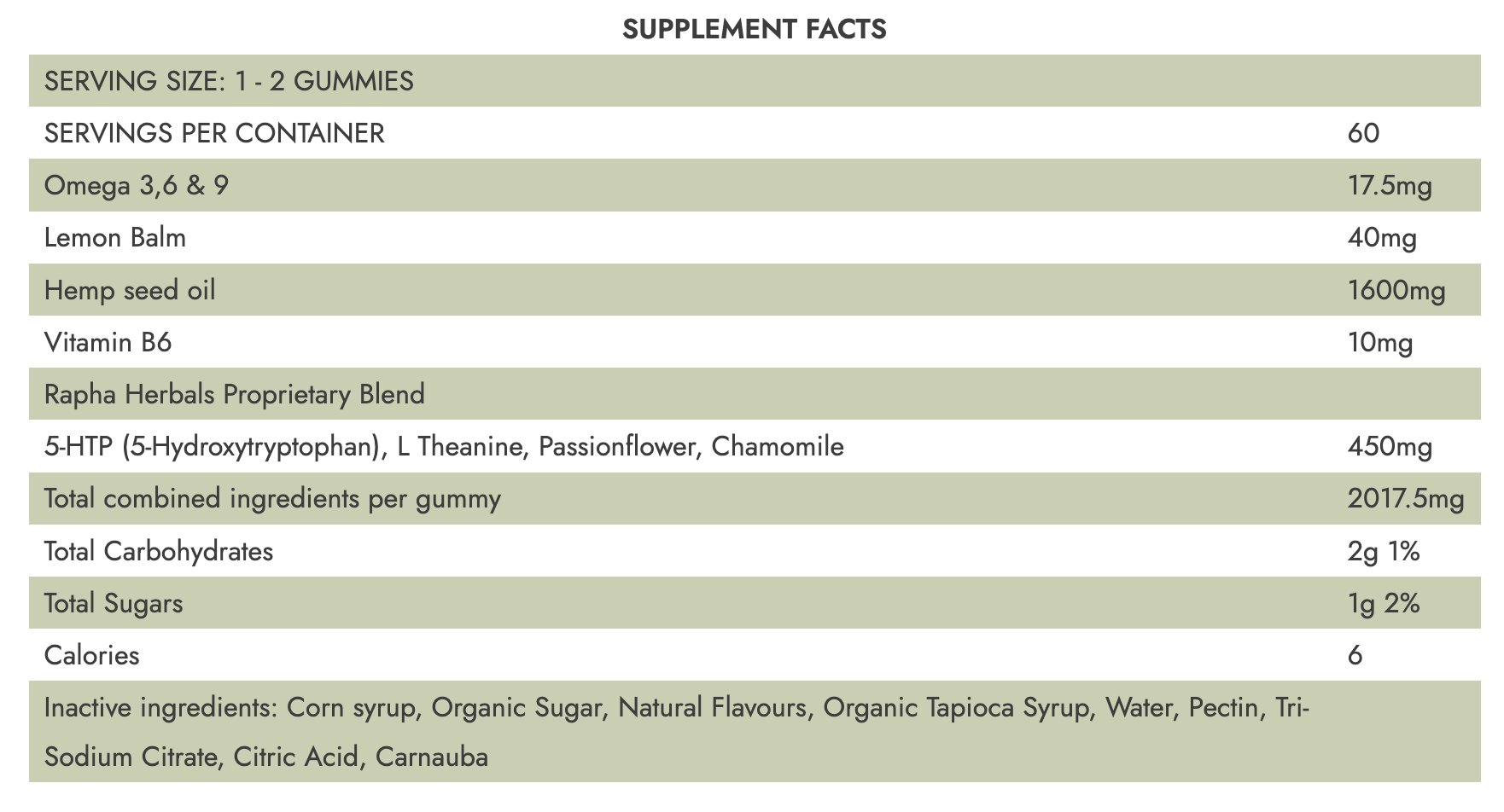 Nourish your body and mind with the calming benefits of Rapha Herbals sleep gummies, formulated to ensure a peaceful night's sleep. With high-quality hemp and natural sleep-inducing ingredients like chamomile, passionflower and L-theanine, these sleep gummies deliver the tranquillity of nature in one potent, easy-to-consume product. Explore the unique properties of our sleep-supporting gummies at Rapha Herbals — unwind, relax and wake up feeling refreshed!