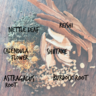 Contains: Reishi, Shiitake, Burdock Root, Astragalus Root, Nettle Leaf and Calendula Flower.