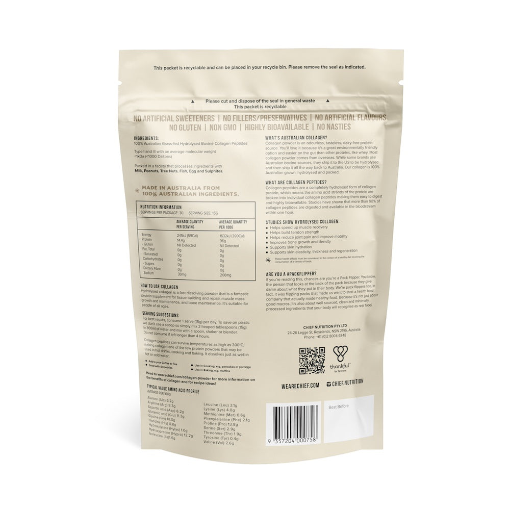 Ingredients: 100% Australian Grass-fed Hydrolysed Bovine Collagen Peptides. Type I and III with an average molecular weight <1kDa